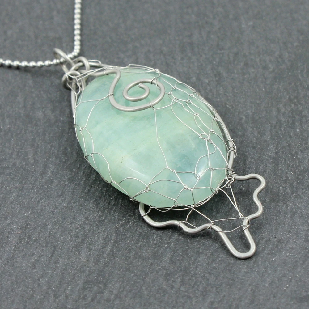 Přívěsek s akvamarínem je vytvořen z nádherného modrozeleného kabošonu. Přívěsek je zavěšen na jemném kuličkovém řetízku, veškerý kov je chirurgická ocel 316(L). Velikost přívěsku je cca 6x2 cm, délka řetízku cca 44 cm + 5,5cm adjusta.