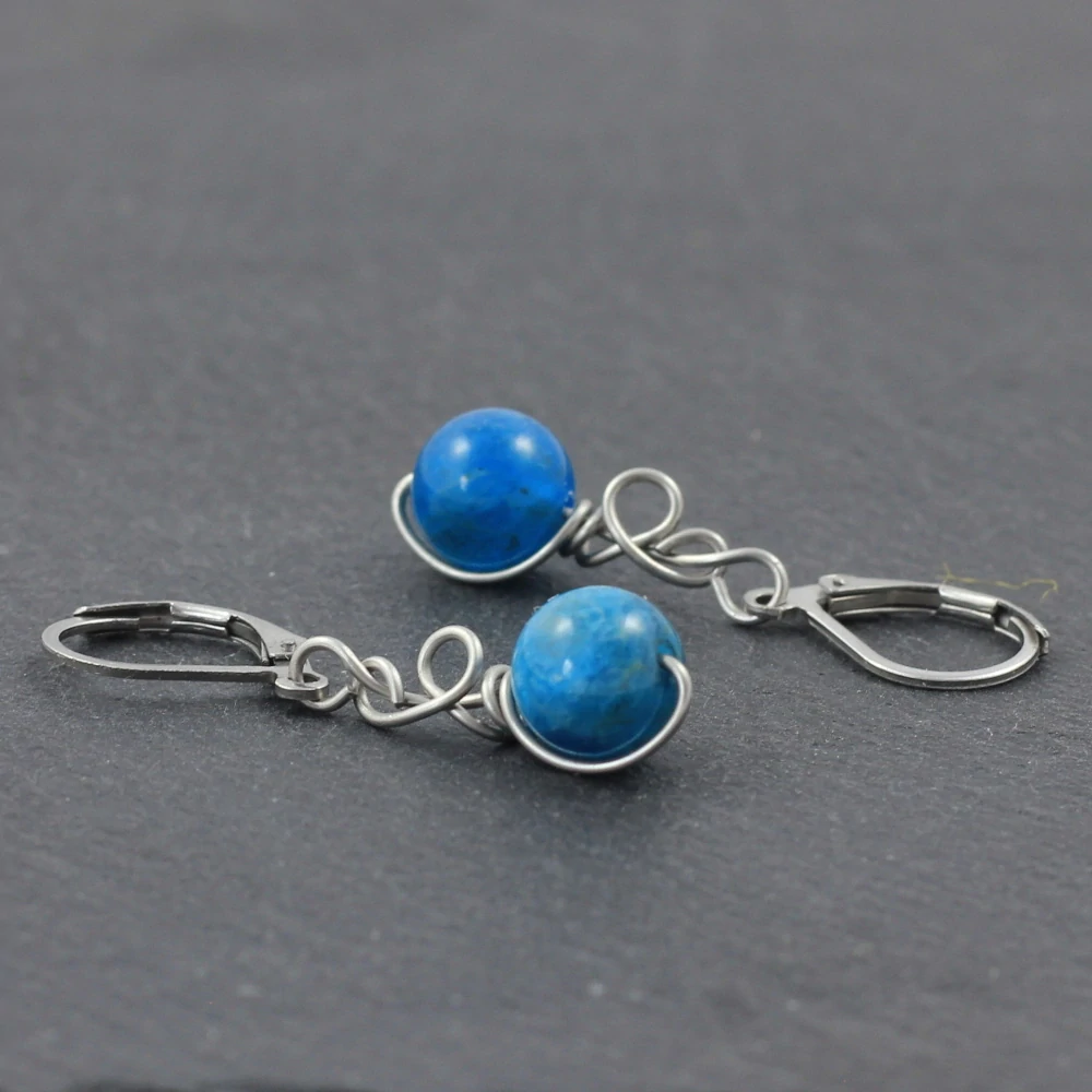 Náušnice s apatitem jsou zhotoveny podle autorského návrhu Zrození. Vytvarovány jsou z ocelového drátu 316L a připevněny na zapínání z chirurgické oceli. Foto ilustrační – každý kus je originál, ani náušnice jednoho páru nejsou identické.
