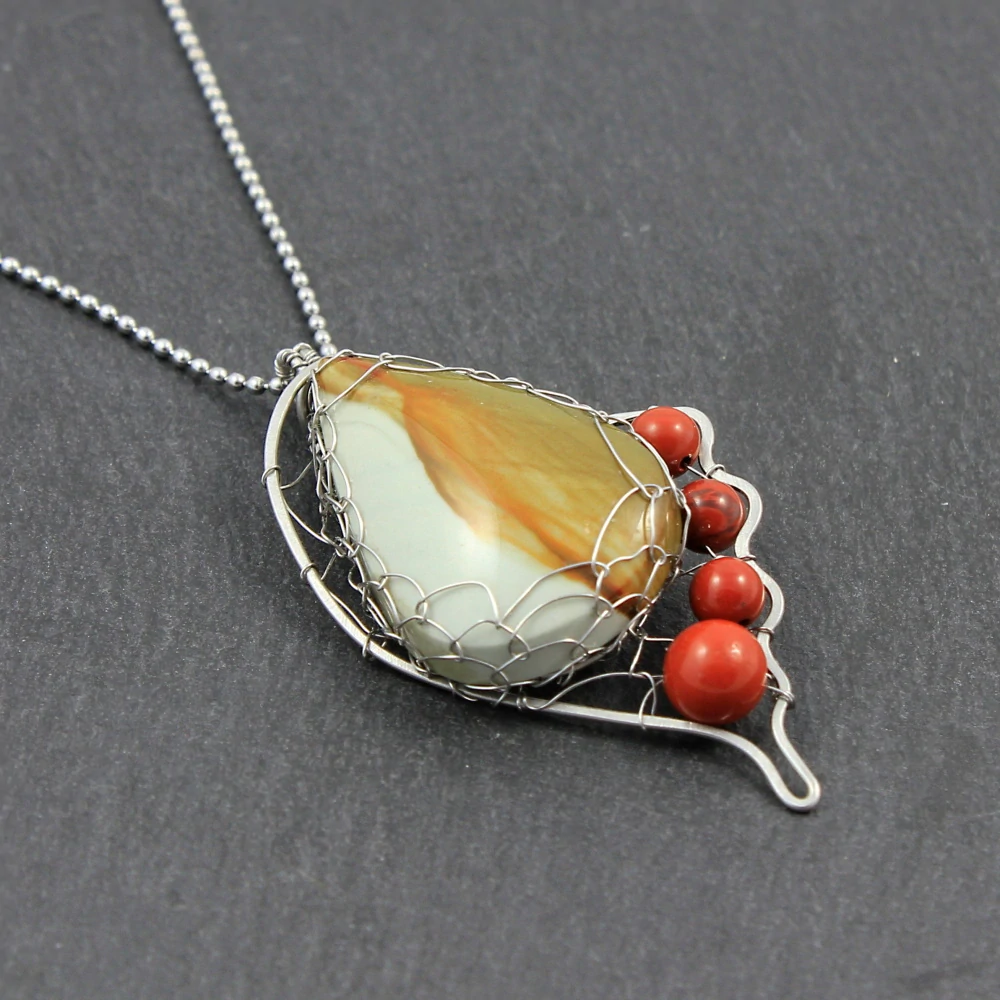 Designový šperk inspirovaný motýlími křídly se zrodil z kabošonu barevného jaspisu a korálků červeného jaspisu. Drátovaný přívěsek je zavěšen na jemném kuličkovém řetízku, veškerý kov je chirurgické oceli 316(L). Velikost přívěsku je cca 4,5 cm, délka řetízku cca 44 cm + 5,5cm adjusta.