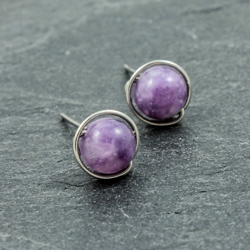 Fialové náušnice bodovky jsou vytvořené z minerálu lepidolitu a z osteodrátu (chirurgické oceli pro implantáty W.Nr. 1.4441). Dodávám se silikonovými zarážkami. Průměr minerálových kuliček je cca 6 mm. Foto ilustrační.