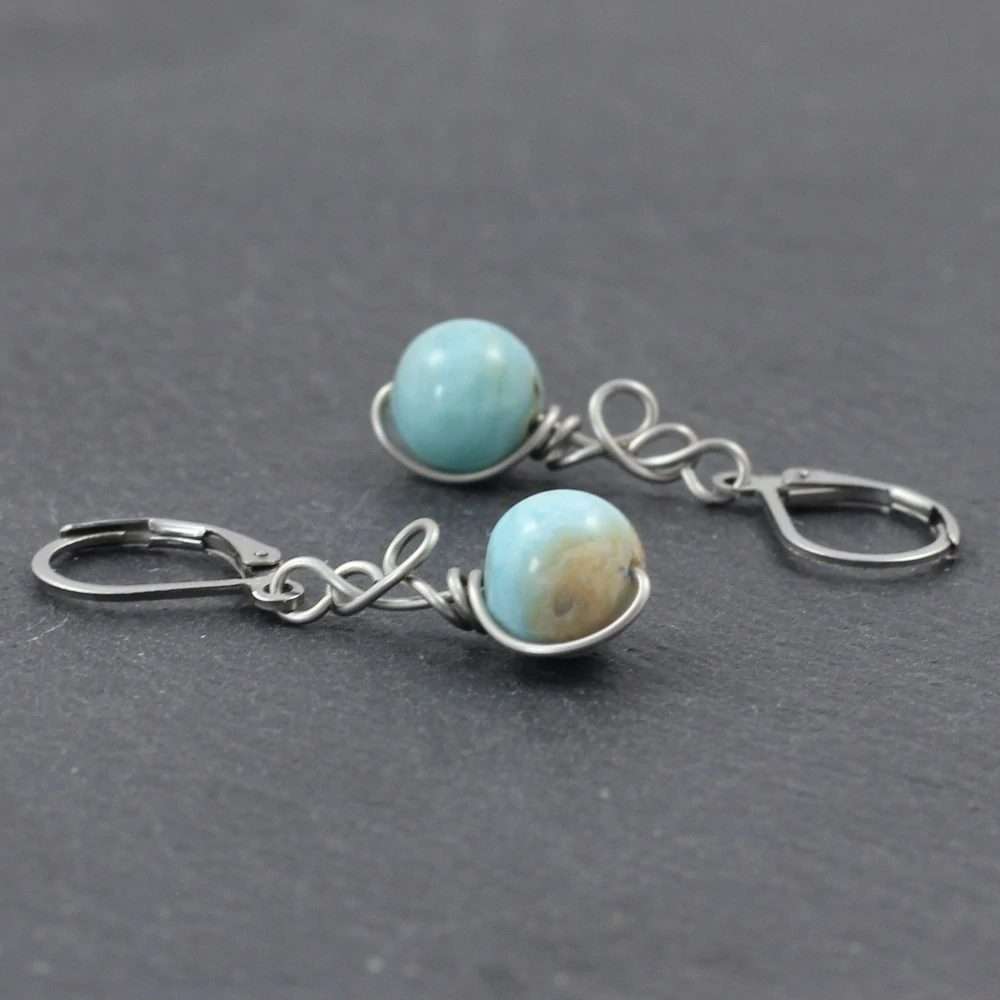 Náušnice s larimarem jsou zhotoveny podle autorského návrhu Zrození. Vytvarovány jsou z ocelového drátu 316L a připevněny na zapínání z chirurgické oceli. Foto ilustrační – každý kus je originál, ani náušnice jednoho páru nejsou identické.