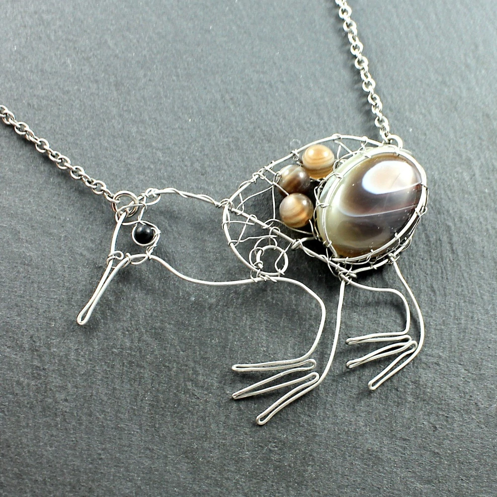 Přívěsek kivi Tuatahi se zrodil z chirurgického nerezového drátu a přírodně zbarvených achátů. Všechny kovové části jsou z chirurgické nerezové oceli 316L.