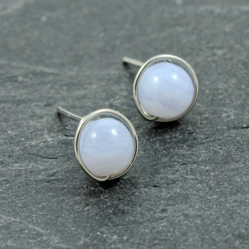 Náušnice modrý chalcedon jsou elegantní pecky v decentně modrém odstínu vytvořené z osteodrátu (chirurgické oceli pro implantáty W.Nr. 1.4441). Dodávám se silikonovými zarážkami. Průměr minerálových kuliček je cca 6 mm. Foto ilustrační.
