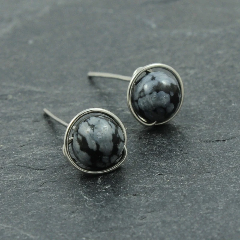 Náušnice puzety s vločkovým obsidiánem mají jedinečnou kresbu připomínající vločky. Jsou ručně drátované z osteodrátu (chirurgické oceli pro implantáty W.Nr. 1.4441). Dodávám se silikonovými zarážkami. Průměr minerálových kuliček je cca 6 mm. Foto ilustrační.