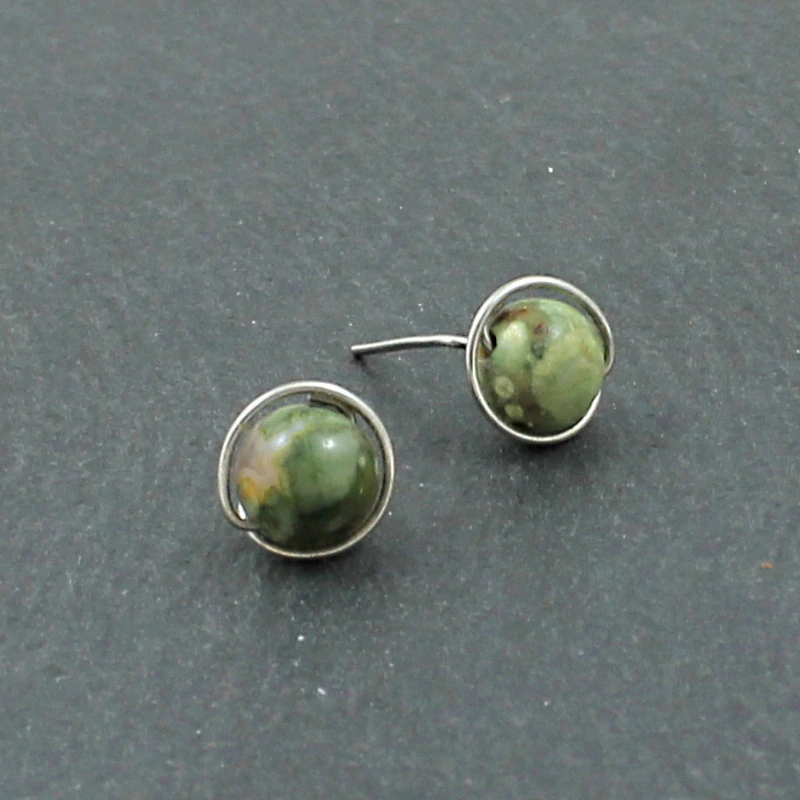 Náušnice s kamínkem ryolitu jsou ručně drátované z osteodrátu (chirurgické oceli pro implantáty W.Nr. 1.4441). Dodávám se silikonovými zarážkami. Průměr minerálových kuliček je cca 6 mm. Foto ilustrační.