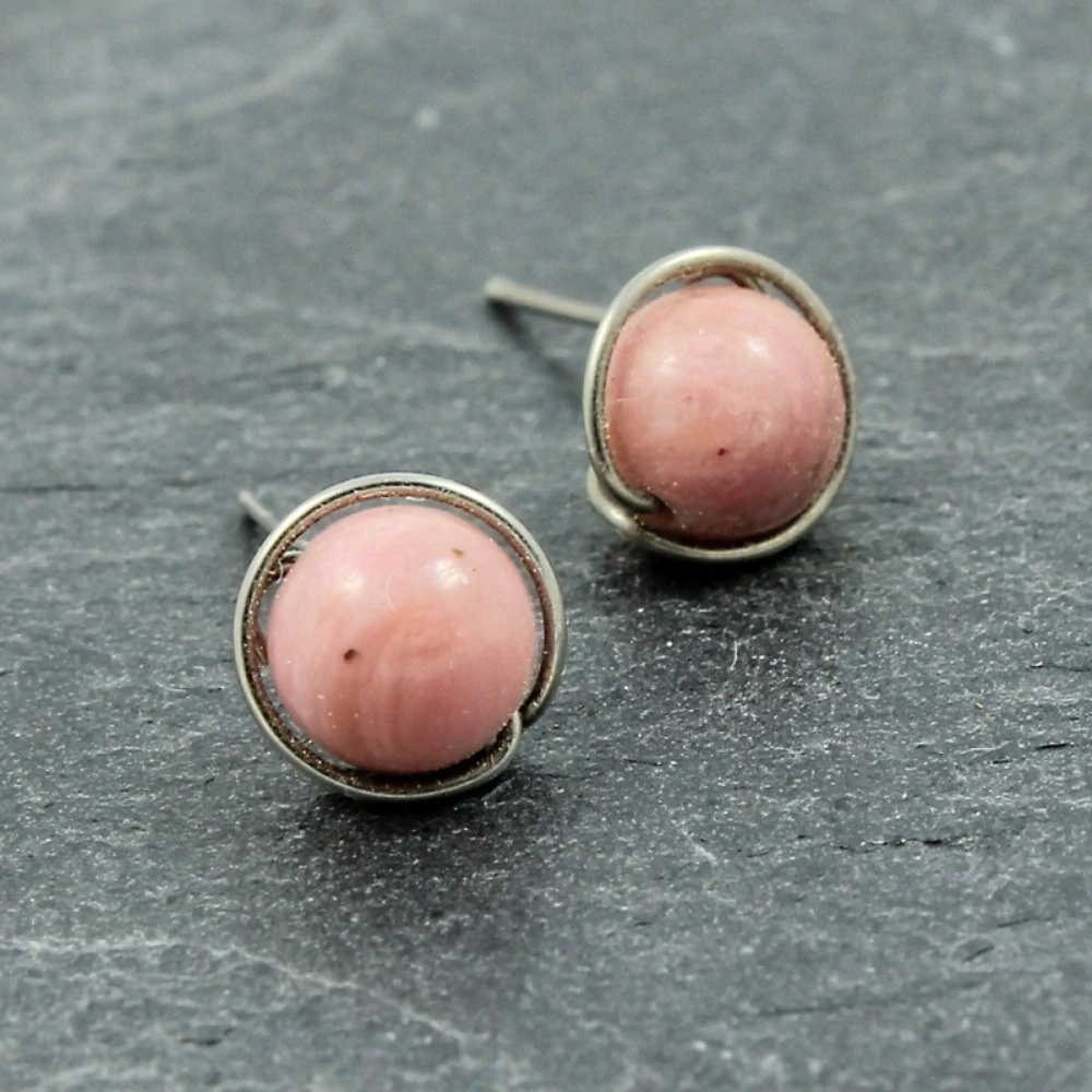 Peckové náušnice s opálem v růžových odstínech jsou drátované z osteodrátu (chirurgické oceli pro implantáty W.Nr. 1.4441). Dodávám se silikonovými zarážkami. Průměr minerálových kuliček je cca 6 mm. Foto ilustrační.