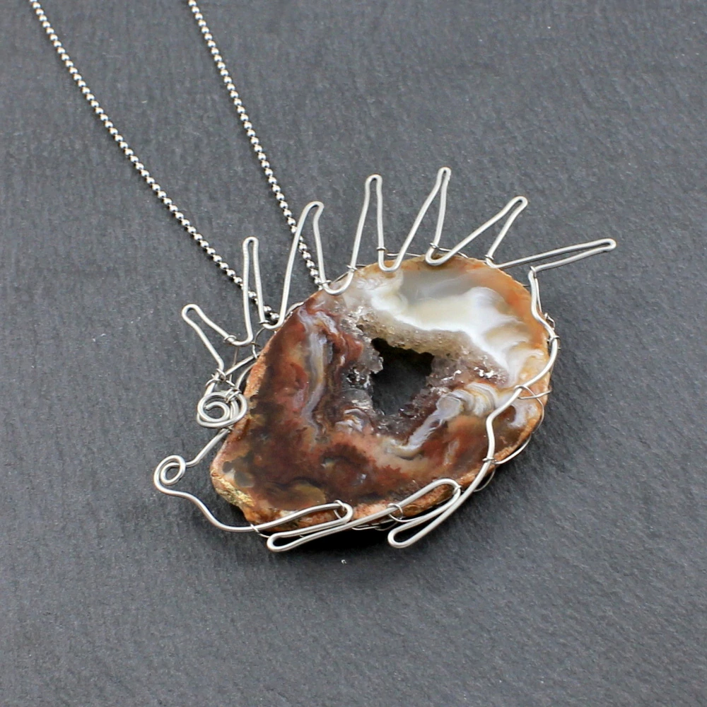 Přívěsek ježka se zrodil z ocelového drátu a peříčkového achátu, který mi svým tvarem právě bodlináče připomínal. Zavěšen je na řetízku se zapínáním na karabinku. Všechny kovové části jsou z chirurgické oceli 316(L).