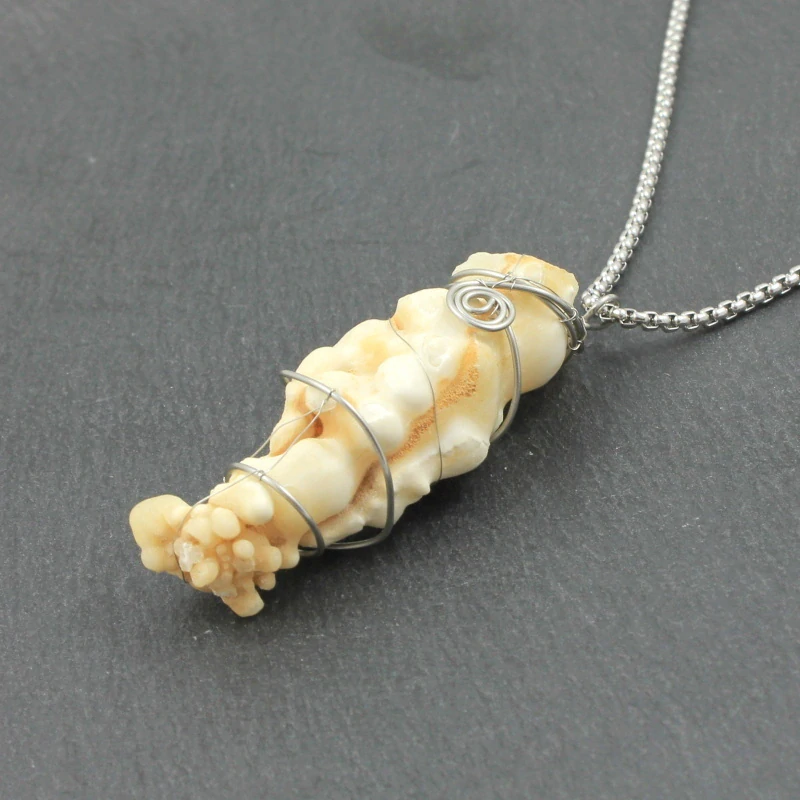 Přívěsek na krk pánský má neopakovatelný tvar a strukturu díky aragonitovo-kalcitovému krápníku z české lokality Vitošov. Velikost přívěsku je cca 5,5 cm, délka řetízku se zapínáním na karabinku cca 45 cm + 5cm adjusta. Všechny kovové části jsou z chirurgické oceli 316L.
