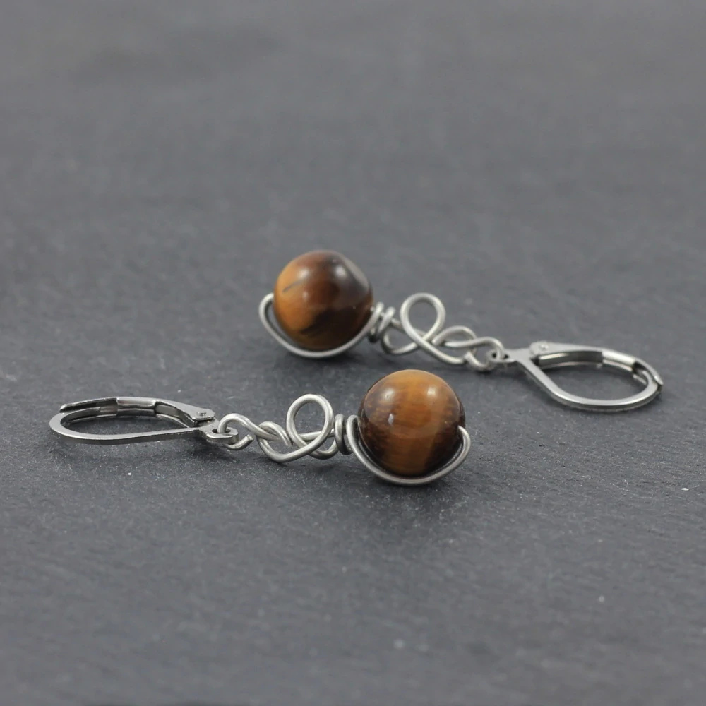 Náušnice s tygřím okem jsou zhotoveny podle autorského návrhu Zrození. Vytvarovány jsou z ocelového drátu 316L a připevněny na zapínání z chirurgické oceli. Foto ilustrační – každý kus je originál, ani náušnice jednoho páru nejsou identické.